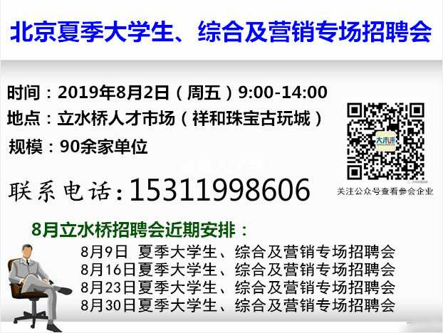 為促進(jìn)北京市人才就業(yè),搭建就業(yè)服務(wù)平臺(tái),促進(jìn)北京地區(qū)人群高校專科、本科、研究生以及社會(huì)人群充分就業(yè),特在立水橋舉辦大型招聘會(huì)。歡迎貴單位參會(huì)招聘人才,為您的企業(yè)發(fā)展補(bǔ)充優(yōu)秀人才!