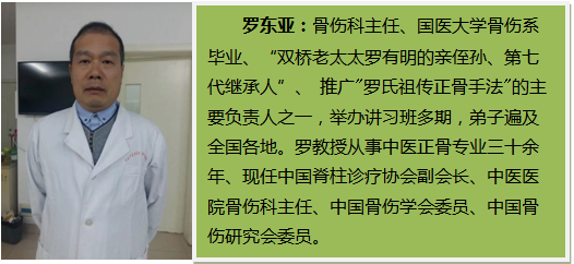 羅東亞:骨傷科主任、國醫(yī)大學骨傷系畢業(yè)、“雙橋老太太羅有明的親侄孫、第七代繼承人”、 推廣"羅氏祖?zhèn)髡鞘址?的主要負責人之一,舉辦講習班多期,弟子遍及全國各地。羅教授從事中醫(yī)正骨專業(yè)三十余年、現(xiàn)任中國脊柱診療協(xié)會副會長、中醫(yī)醫(yī)院骨傷科主任、中國骨傷學會委員、中國骨傷研究會委員。