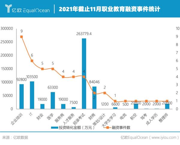 除了政策利好,職業(yè)教育亦受到資本青睞。截止11月,2021年已有云學(xué)堂、UMU互動(dòng)學(xué)習(xí)平臺(tái)、課觀教育、三節(jié)課等多家職業(yè)教育相關(guān)企業(yè)獲得多輪融資,融資事件累計(jì)達(dá)56次,并迎來了傳智教育、職業(yè)教育兩家職業(yè)教育企業(yè)的上市,覆蓋職業(yè)教育中服務(wù)提供商和學(xué)習(xí)咨詢平臺(tái)。 根據(jù)億歐智庫數(shù)據(jù)顯示,2021年截止11月,職業(yè)教育融資事件中,A輪融資和并購項(xiàng)目數(shù)量最多超過行業(yè)整體的三分之一,而從細(xì)分的投資方向來看,企業(yè)培訓(xùn)類企業(yè)在今年的融資較多,IT、招錄考試、財(cái)商和醫(yī)學(xué)類賽道也是資本市場(chǎng)較為活躍和關(guān)注的領(lǐng)域。