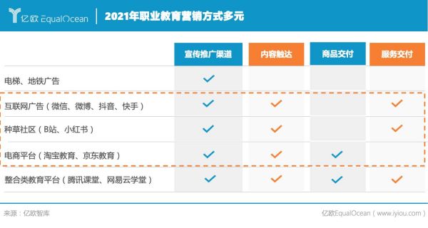 以就業(yè)為導(dǎo)向的人才適應(yīng)性提升 職業(yè)教育作為以就業(yè)為導(dǎo)向的教育方式,其適應(yīng)性不僅只體現(xiàn)在人才培養(yǎng)上,還在于人才的管理和服務(wù)。 在人才培養(yǎng)的學(xué)歷階段,職業(yè)院校是主要的培養(yǎng)方,2021年10月中共中央辦公廳、國務(wù)院辦公廳印發(fā)《關(guān)于推動(dòng)現(xiàn)代職業(yè)教育高質(zhì)量發(fā)展的意見》就加快構(gòu)建現(xiàn)代職業(yè)教育體系做出進(jìn)一步的部署。人才適應(yīng)能力的提升一方面來自于職業(yè)教育體系和普通教育體系的橫向融通和縱向貫通,打通升學(xué)渠道,另一方面則是面向市場(chǎng),以企業(yè)崗位需求為目標(biāo),通過綜合的育人機(jī)制,改善職業(yè)教育學(xué)歷階段的人才供給結(jié)構(gòu)。 企業(yè)則是通過校企合作和自主培養(yǎng),輸出資金、技術(shù)、實(shí)踐案例,吸納專業(yè)人才,強(qiáng)化品牌認(rèn)知。 隨著靈活用工方式的出現(xiàn)從人員招聘、用工管理到員工技能培訓(xùn)、權(quán)益保障都有對(duì)應(yīng)的服務(wù)提供,人與崗位,人才與企業(yè)之間匹配的靈活性增加、時(shí)效性增強(qiáng),帶來了人才服務(wù)效率的整體提升。 在線化職業(yè)教育服務(wù)交付 在線化服務(wù)交付,顧名思義,教育的在線化是社會(huì)經(jīng)濟(jì)高質(zhì)量飛躍、互聯(lián)網(wǎng)等技術(shù)成熟發(fā)展的必然結(jié)果,在不斷提高的互聯(lián)網(wǎng)普及率和新冠疫情的沖擊下,職業(yè)教育的全面在線化為行業(yè)升級(jí)的新成果。而招生營(yíng)銷和教學(xué)形式的全面升級(jí)是職業(yè)教育在線化后表現(xiàn)最為突出的兩方面。