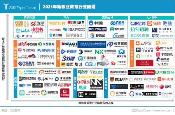 02圍繞適應(yīng)性、在線化、終身化的新職業(yè)教育發(fā)展新形態(tài) 在傳統(tǒng)職業(yè)技能培養(yǎng)的需求仍舊旺盛的情況下,新興的行業(yè)所孕育的新的職業(yè)技能培訓(xùn)相繼入局。部分K12教育企業(yè)嘗試布局;淘寶教育、京東教育等則是為職業(yè)教育企業(yè)的電商運(yùn)營(yíng)提供了新的場(chǎng)景。 一方面,技術(shù)的升級(jí)推動(dòng)了新職業(yè)教育在營(yíng)銷種草,在線學(xué)習(xí),系統(tǒng)支持,人才服務(wù)等環(huán)節(jié)上的全面在線化升級(jí),另一方面,隨著退休年齡的延長(zhǎng),職業(yè)教育的潛在人群規(guī)模不斷擴(kuò)大,職業(yè)群體對(duì)于學(xué)習(xí)課程內(nèi)容也逐漸多樣化,隨之而來產(chǎn)生了大量的企業(yè)提供對(duì)應(yīng)的學(xué)習(xí)服務(wù)。頭部互聯(lián)網(wǎng)公司也開始發(fā)揮自身在新興產(chǎn)業(yè)人才培養(yǎng)上的優(yōu)勢(shì),提供相應(yīng)的職業(yè)教育服務(wù),受到尋求新興職業(yè)發(fā)展的人群青睞。 億歐智庫認(rèn)為,圍繞適應(yīng)性、在線化、終身化三大發(fā)展方向,職業(yè)教發(fā)展趨于繁榮的同時(shí)逐漸延伸出三類發(fā)展新形態(tài)。