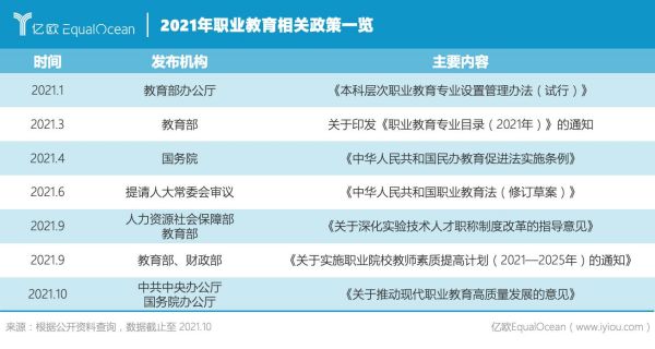 2021年,全國職業(yè)教育大會(huì)的召開,會(huì)議對(duì)職業(yè)教育工作做出重要指示,強(qiáng)調(diào)在全面建設(shè)社會(huì)主義現(xiàn)代化國家新征程中,職業(yè)教育前途廣闊、大有可為,無不體現(xiàn)出我國當(dāng)前對(duì)職業(yè)教育的重視。