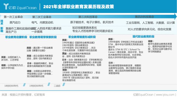 第一次工業(yè)革命后,以學(xué)徒制為主的職業(yè)教育萌芽出現(xiàn),主要以英國、德國職業(yè)教育體系為代表;二戰(zhàn)后,各國產(chǎn)業(yè)結(jié)構(gòu)呈現(xiàn)多元豐富的發(fā)展趨勢(shì),職業(yè)教育逐步實(shí)現(xiàn)制度化、體系化發(fā)展,英美日德各自頒布職業(yè)教育相關(guān)法律促進(jìn)職業(yè)教育規(guī)范化發(fā)展;信息化時(shí)代來臨,信息網(wǎng)絡(luò)數(shù)字化為主的職業(yè)教育培訓(xùn)迎來新的發(fā)展期。