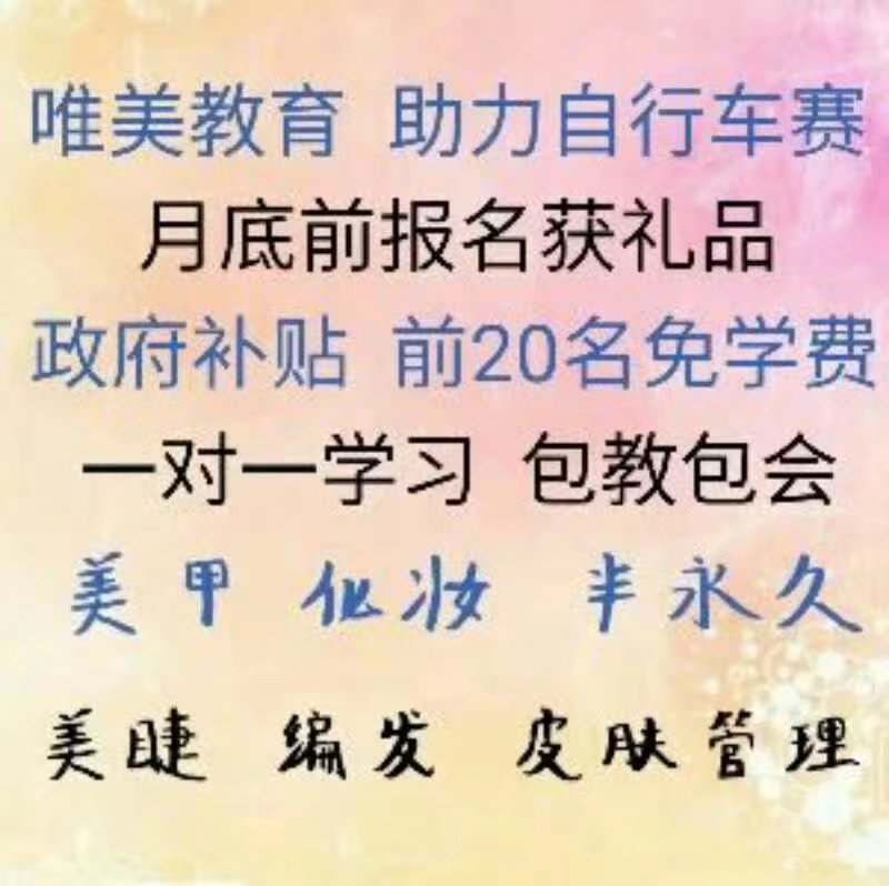 驚喜 驚喜 特大驚喜 唯美教育學(xué)校為迎接 邢臺(tái)自行車賽 特為愛美人士重推出以下助學(xué)活動(dòng): 凡在活動(dòng)期間外地需住宿學(xué)習(xí)的學(xué)員報(bào)名,即可獲得免住宿費(fèi)1 個(gè)月 凡在活動(dòng)期間報(bào)名學(xué)習(xí)的寶媽,均可為自己親愛的寶寶獲得超級(jí)可愛書包1 個(gè) 凡在活動(dòng)期間報(bào)名學(xué)習(xí)的單身女孩或已婚但未當(dāng)寶媽的學(xué)員,可獲得超級(jí)大超級(jí)可愛的1.6米泰迪熊或1.6米瞌睡熊毛絨玩具1 個(gè)(每個(gè)均有7 個(gè)顏色可選哦) 活動(dòng)時(shí)間:2017 年8 11 ——2017年8 月31  只要你愛美 只要你愛好 只要你愛學(xué) 只要你喜歡 那麼就不要再猶豫了 機(jī)會(huì)不多,失不再來(lái) 心動(dòng)不如行動(dòng),趕緊行動(dòng)吧