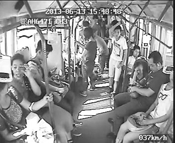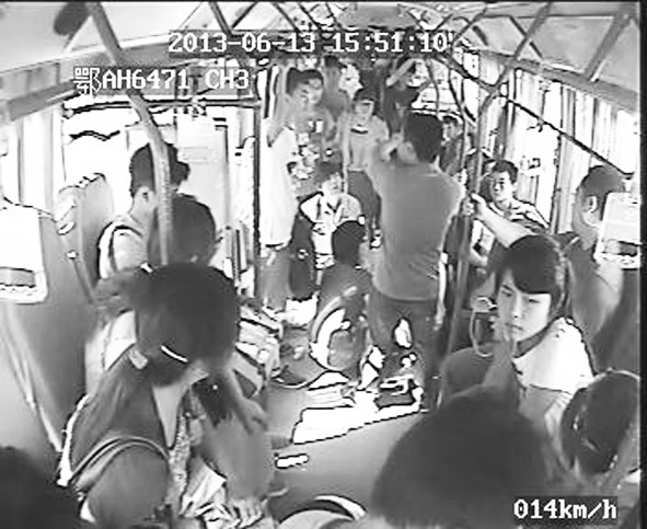 1名女性乘客在公交車(chē)上突然昏厥,來(lái)自武漢船舶職業(yè)技術(shù)學(xué)院的姚作霖、李瀟瀟、周勇、楊承杰、文德麟、羅權(quán)、周雪東、李峰、曹思明9名大學(xué)生伸出援手熱心相助。