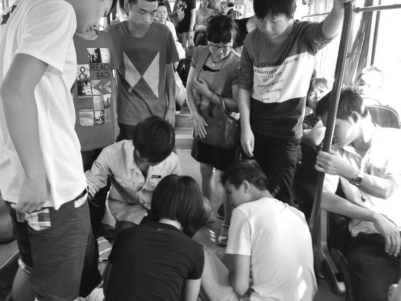 報(bào)道詳細(xì)還原了發(fā)生在6月13日的那一幕:武漢船舶職業(yè)技術(shù)學(xué)院的姚作霖、周雪東、周勇、李峰、羅權(quán)、李瀟瀟、文德麟、楊承杰、曹思明等9名同學(xué)面試完暑期工回學(xué)校途中,在一輛801公交車(chē)上突遇一名女性乘客突發(fā)癲癇,9名同學(xué)立即施救:姚作霖和周雪東將這名女乘客扶住,10秒鐘后,姚作霖跑向駕駛臺(tái)通知司機(jī)并報(bào)警,文德麟等人一起幫忙扶托住女青年,李瀟瀟蹲下來(lái)幫女青年擦掉她面部的口水,周雪東則一直專(zhuān)注地掐著女青年的人中,同時(shí),姚作霖用女青年的手機(jī)與她的朋友、家人聯(lián)系,大家也一直托著這名女青年。在大家的施救下,這名女青年終于醒來(lái),并被隨后到來(lái)的救護(hù)車(chē)送往醫(yī)院。