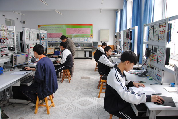 我校的電子技術(shù)應(yīng)用專業(yè),是省級骨干示范專業(yè),通過多年的專業(yè)建設(shè)和教學(xué)改革,建立起了符合用人單位要求的的課程體系 ,在理論教學(xué)方面增加新技術(shù)、新知識、新工藝,體現(xiàn)專業(yè)教學(xué)內(nèi)容的先進性,開設(shè)了《EDA技術(shù)》《Protel教程》《單片機系統(tǒng)》《PLC控制》《自動檢測技術(shù)》《C語言》等課程,在專業(yè)技能培訓(xùn)方面,我校擁有建筑面積8810平方米的實驗樓,其中電工電子、電力拖動、家電綜合、電工技能、CAD、PLC(可編程控制器)、單片機仿真實驗室、制冷等近12個專業(yè)實驗室和模擬室,其中絕大多數(shù)實驗室具有較高的現(xiàn)代化水平,配套齊全,檔次高,設(shè)備利用率在95%以上。學(xué)?,F(xiàn)有微機280余臺,微機專業(yè)教學(xué)用微機生均1人1臺,非微機專業(yè)生均達6人1臺,滿足了專業(yè)技能教學(xué)的需要。