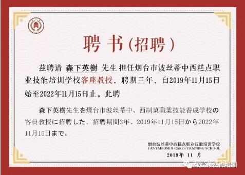 ??近日,日本烘焙大師森下英樹先生受聘成為煙臺波絲蒂西點培訓(xùn)學(xué)校的客座教授,聘期三年,學(xué)校舉行了聘任儀式,陳紅林校長為森下先生頒發(fā)了聘書。