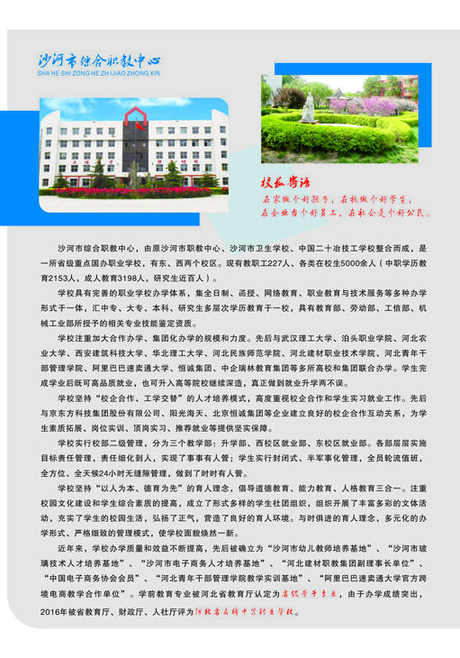 河北省沙河市綜合職教中心介紹 河北沙河市綜合職教中心始建于1995年,2011年7月沙河市人民政府將原二十冶技校(含邢臺機械電子工程學校)、原沙河市衛(wèi)生學校合并到沙河市綜合職教中心。 整合后的職教中心以“先搭建框架,再豐滿血肉”為辦學思路,通過開展多資質(zhì)、多層次、多形式、多類別辦學,逐步構(gòu)建起全日制學歷教育、成人教育和職業(yè)培訓并舉的立體職教框架,形成了學歷教育與職業(yè)培訓規(guī)模大體相當,全日制中職教育與成人教育規(guī)模大體相當、升學教育與就業(yè)教育規(guī)模大體相當?shù)霓k學格局。 河北省沙河市綜合職教中心占地99101平方米(148.6畝),分為東、西兩個校區(qū),總建筑面積為..