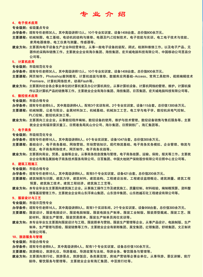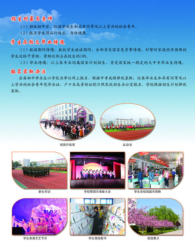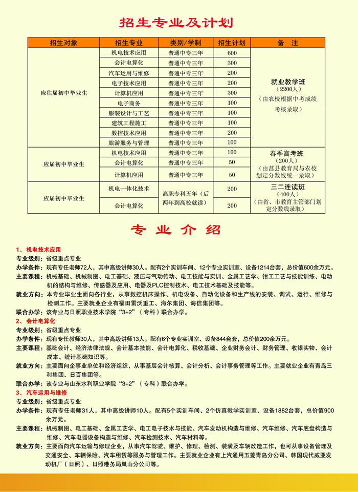 日照市農業(yè)學校(莒縣職教中心)是日照市人民政府舉辦的一所普通中等專業(yè)學校,始建于1979年,1995年被教育部認定為國家級重點職業(yè)學校,2005年被教育部確定為國家級電工電子與自動化實訓基地。 學校地處國家AAA級旅游區(qū)浮來山腳下,占地300畝,建筑面積8萬平方米,在校生4000余人(其中“三二”連讀大專班學生810人),教職工450人。專任教師中碩士研究生以上學歷20人,高級職稱105人?,F(xiàn)建有1個校內綜合實訓車間、18口實驗實習室和12個校外頂崗實習基地。 學校緊緊圍繞經濟建設與社會發(fā)展,實行按需辦學,定向培養(yǎng)?,F(xiàn)開設9個專業(yè),其中機電技術及應用、電子技術及應用、計算機技..
