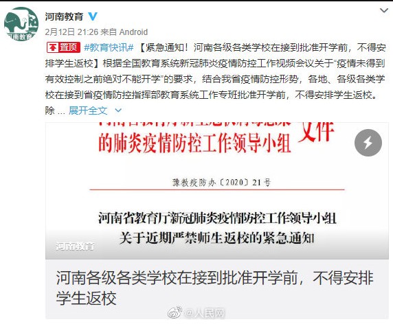 【開學(xué)時間待定!河南各地不得安排學(xué)生返?!?河南教育緊急通知:各地、各級、各類學(xué)校在接到省疫情防控指揮部教育系統(tǒng)工作專班批準開學(xué)前,不得安排