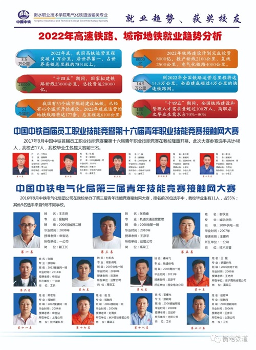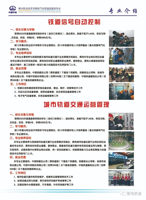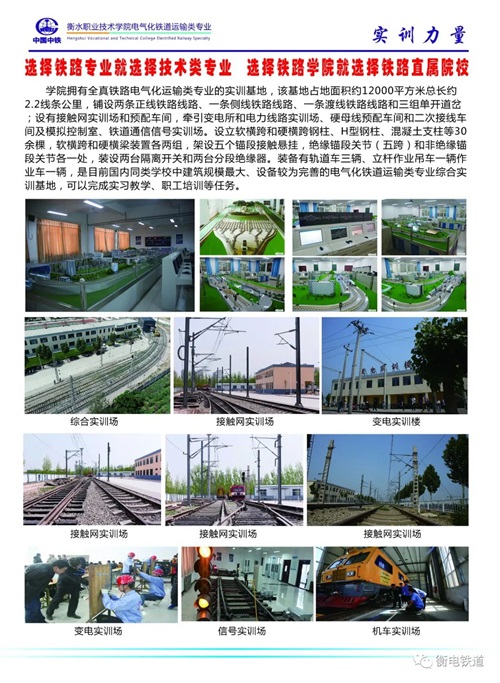 衡水職業(yè)技術(shù)學(xué)院電氣化鐵道運輸類專業(yè)是學(xué)院與中國中鐵深入校企合作、產(chǎn)教融合共建特色專業(yè),打造鐵路和軌道交通行業(yè)“文化素質(zhì)+職業(yè)技能”的新型大學(xué)生人才培養(yǎng)模式,是全國鐵路企業(yè)舉辦的電氣化鐵道運輸類專業(yè)的國家級重點職業(yè)院校,是國家電氣化鐵道運輸類和地鐵行業(yè)后備力量的主要來源,是中國電氣化鐵道運輸類高技能人才培養(yǎng)基地。學(xué)院下設(shè)"鐵道供電技術(shù)”、“鐵道信號自動控制"、城市軌道交通運營管理"、“鐵道機車運用與維護”專業(yè),具備了全日制大專學(xué)生的培養(yǎng)資格,打造鐵路及軌道交通行業(yè)"文化素質(zhì)+職業(yè)技能"的新型大學(xué)生人才培養(yǎng)模式,突出   "應(yīng)用"  與  "技能"兩個特點,在提高大學(xué)生文化素質(zhì)的基礎(chǔ)上,運用學(xué)校雄厚師資和全真鐵路"四電"及運輸專業(yè)綜合實訓(xùn)基地開展“真刀真槍"的實訓(xùn)課程.使培養(yǎng)出來的大學(xué)生不是只懂理論知識的花瓶,而是成為I正掌握實際操作技能的優(yōu)秀者。